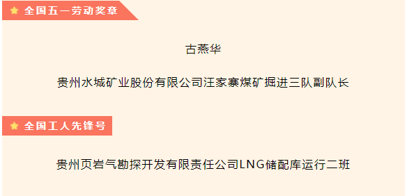 4月28日,中华全国总工会召开大会表彰2024年全国五一劳动奖和全国工人先锋号获得者。贵州能源集团1名个人获全国五一劳动奖章,1个集体获全国工人先锋号。