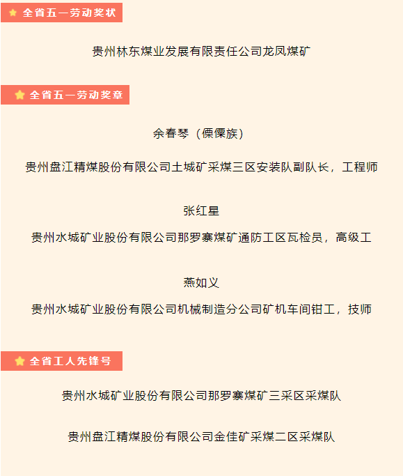 4月29日,贵州省庆祝“五一”国际劳动节暨表彰大会在贵阳召开。全省评选五一劳动奖状46个、五一劳动奖章157个、工人先锋号129个。贵州能源集团1个集体获全省五一劳动奖状,3名个人获全省五一劳动奖章,2个集体获全省工人先锋号。
